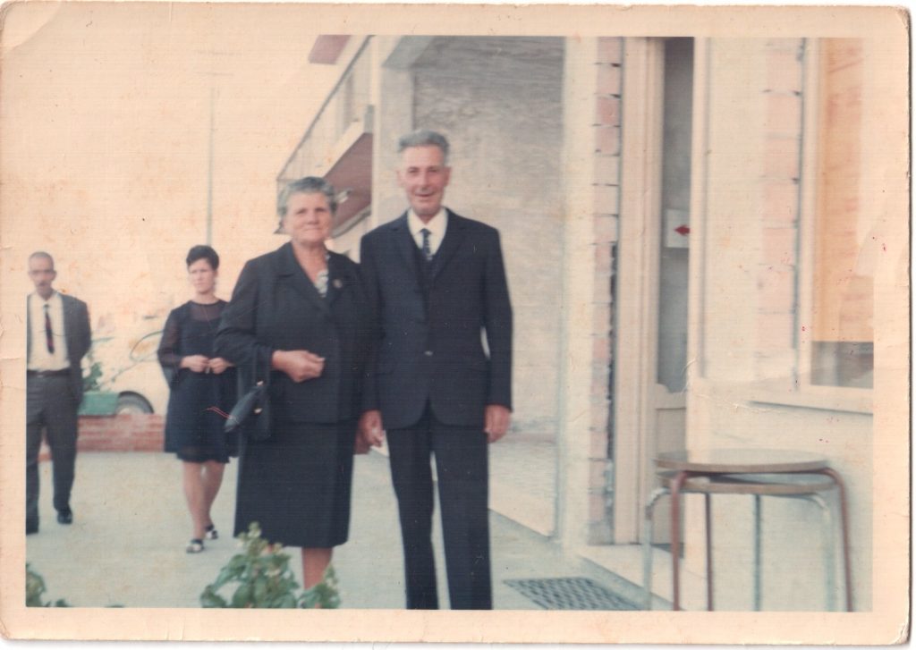 Osservando questa fotografia i miei bisnonni Teresa e Mario, si trovano quasi sicuramente in Abruzzo, negli anni ’60. Questo ce lo dicono l’abbigliamento e i tratti delle persone che sono alle loro spalle